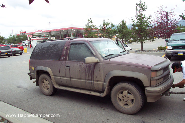 Here I am, unhooking the Chevy Tahoe in the parking lot of a Fred Meyer's in Anchorage Alaska. At least I *Think* that's my dinghy; It is attached to the motorhome, but it's hard to recognize.